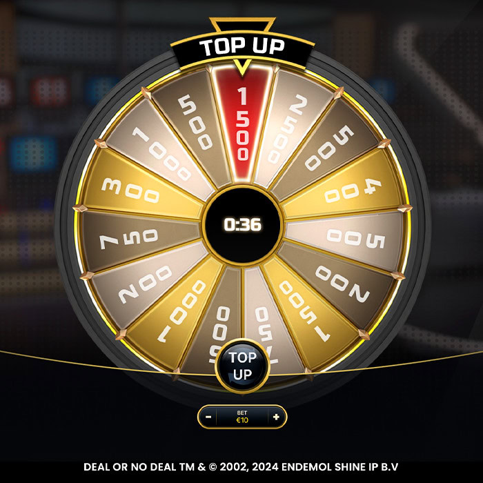 Once you have qualified for the Bonus round and while waiting for it to begin, you have the opportunity to spin the Top-Up wheel. As the countdown begins, select any of the 16 briefcases and spin the wheel to increase the briefcases value by 5x to 50x your bet. You can change the briefcase to top-up before each spin.